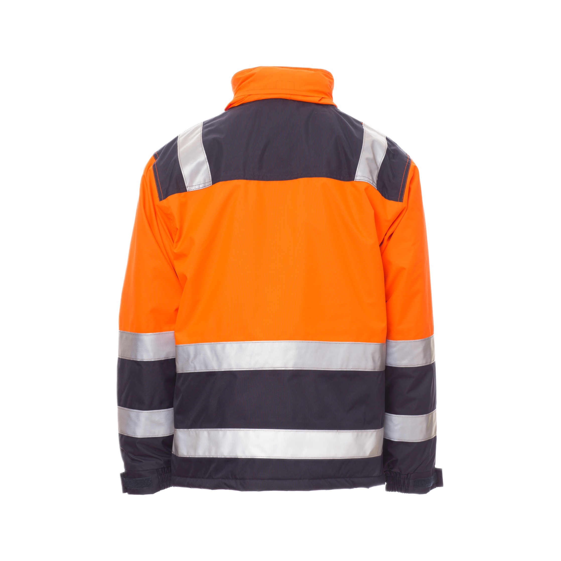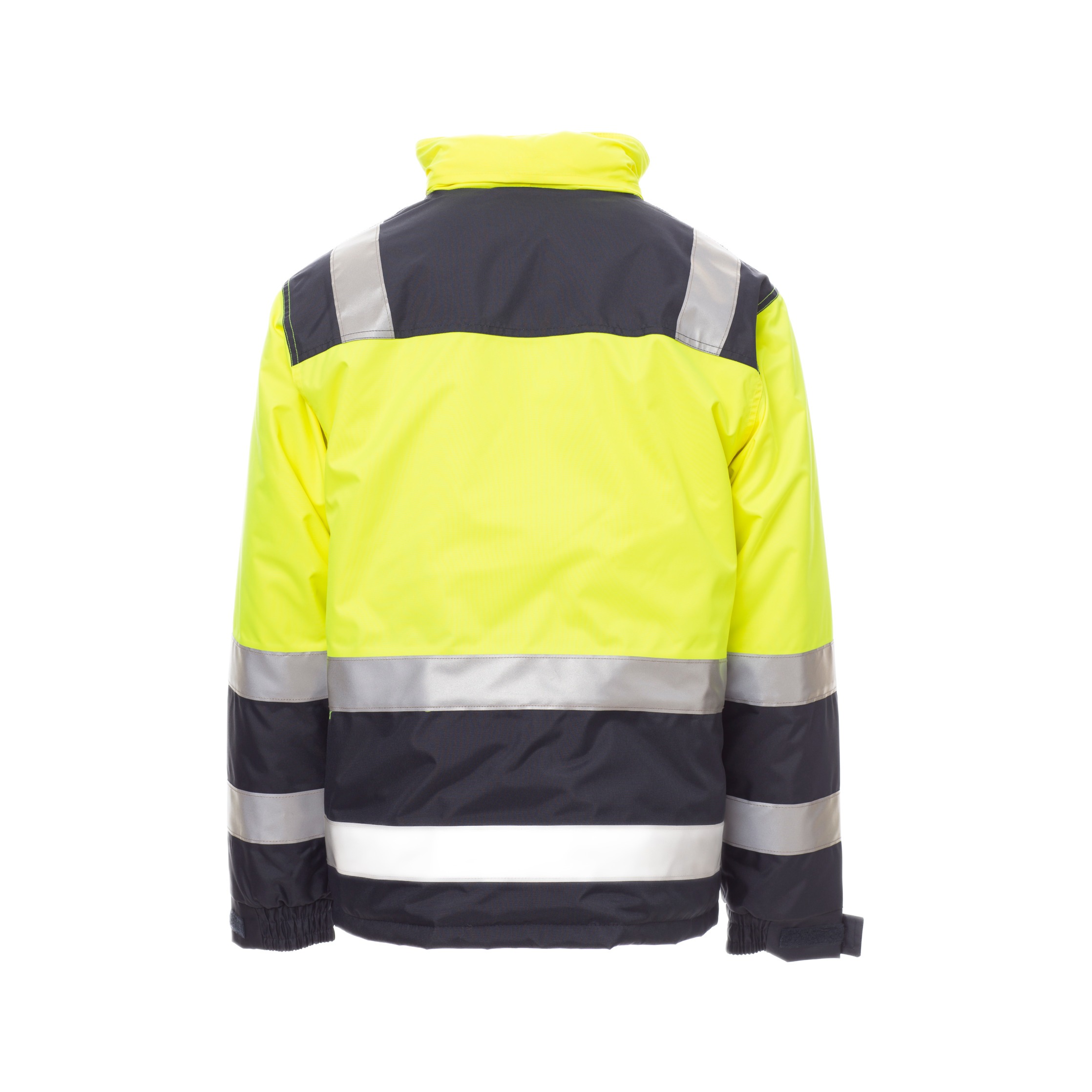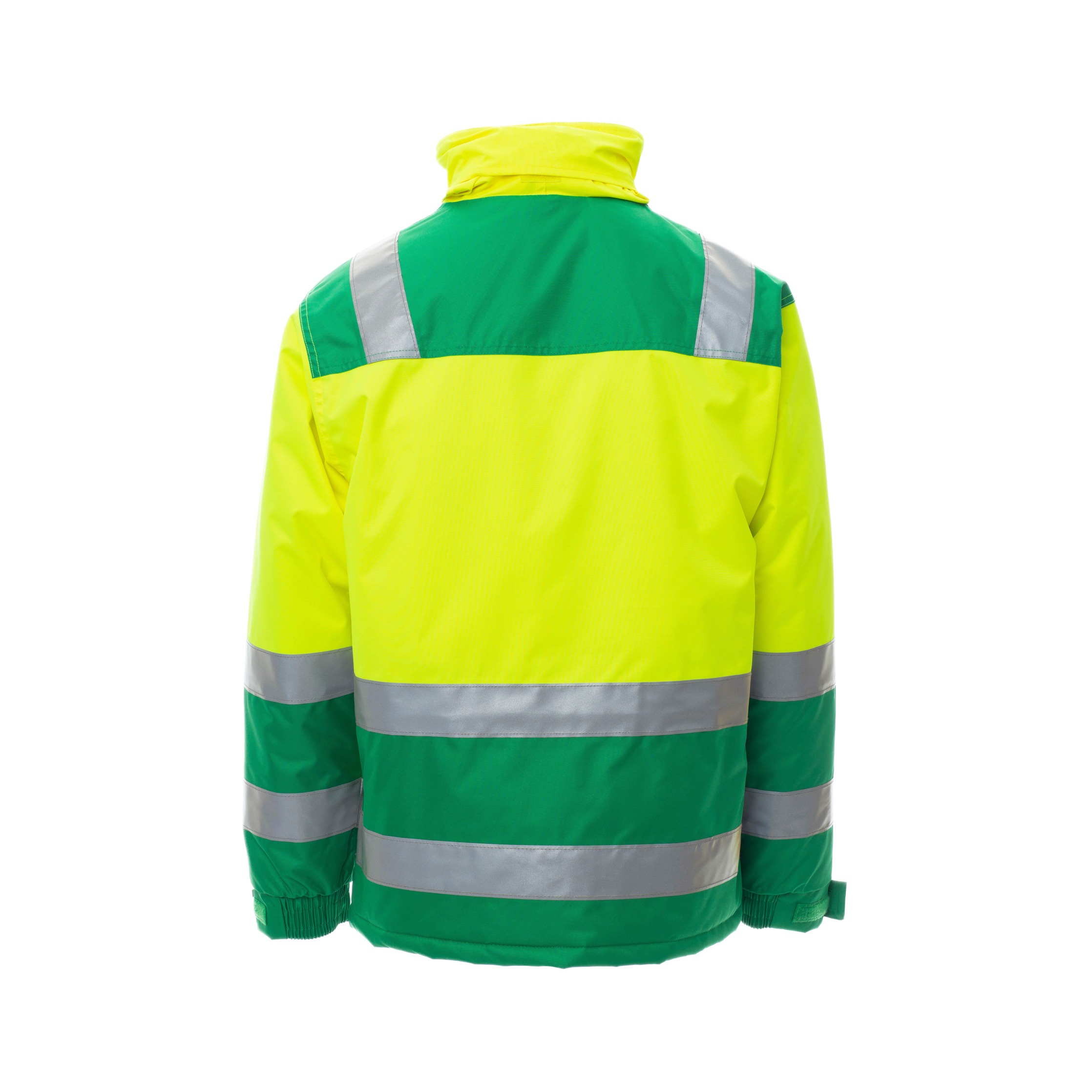 Die umlaufenden Reflexstreifen erfüllen die Anforderungen der EN ISO 20471 Klasse 2, die internationale Norm für Warnschutzkleidung. Diese Norm garantiert, dass die Jacke durch fluoreszierendes Material und reflektierende Elemente auch bei schlechten Lichtverhältnissen gut sichtbar bleibt. Zusätzlich ist die Jacke nach CE Reg UE 2016/425 – Kategorie II zertifiziert und entspricht den europäischen Vorgaben für persönliche Schutzausrüstung.